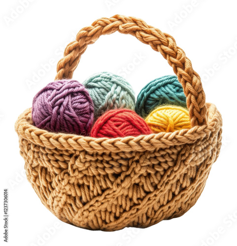Colorful yarn balls in a woven basket for crafting isolated on transparent background