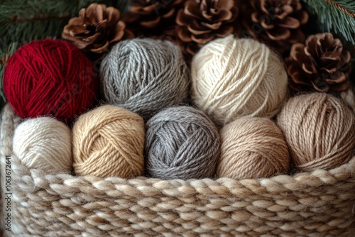 Colorful Yarn Balls in Woven Basket with Pine Cones