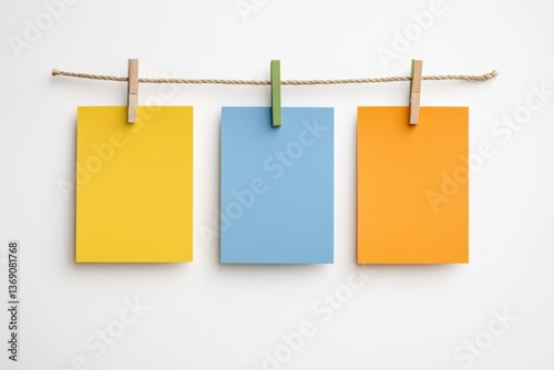 Colorful yellow, blue, and orange paper strips hanging on a rope against a white background