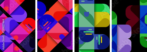 Colorfulness explodes in four vibrant geometric designs featuring rectangles and triangles in shades of purple violet, magenta, tints, and shades. An artistic pattern on a black background