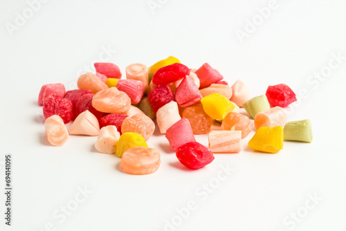 Colorful,Traditional Turkish Hard Candy Akide, from ,Ottoman Cuisine heap on white surface with copy space