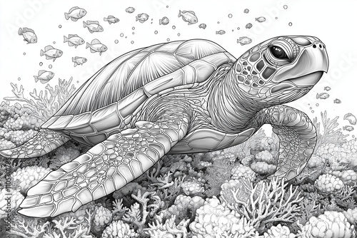 coloriage, illustration tortue, animaux marins, noir et blanc, enfants, fun, dessin, mignon, tout-petits, adorable, joli