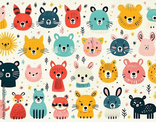 Colorido dibujo de dibujos animados con animales del bosque lindos y caras soleadas en un fondo ligero
