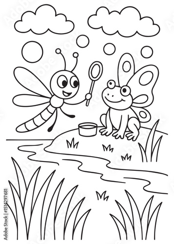 Coloring book dragonfly giving a bubble wand to a smiling frog by a pond