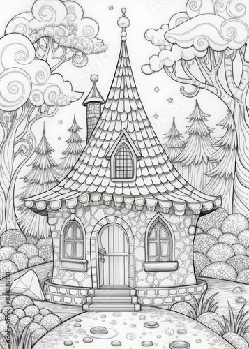 Coloring book for adult and older children. Coloring page with fairy house in the garden.