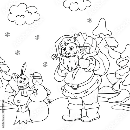Coloring book for children, Santa Claus with rabbit. Holiday scenery outline vector illustration.