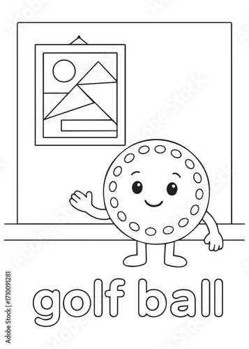 coloring book golf ball in school hallway with framed artwork, simple kids activity illustration
