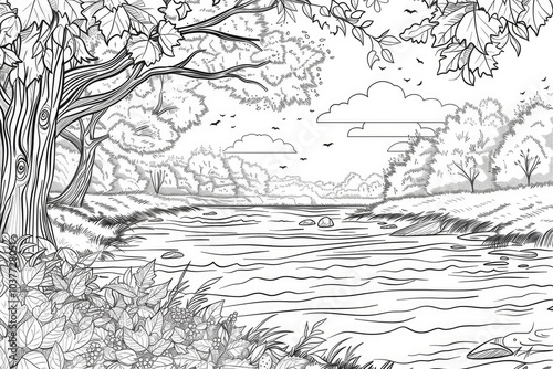 Coloring book illustration of a serene scene by the river in autumn