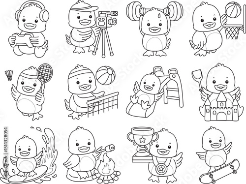 Coloring book of Cute Duck icon. Outline of Funny baby Duck animal series stock illustration. life of fluffy Duck designs.