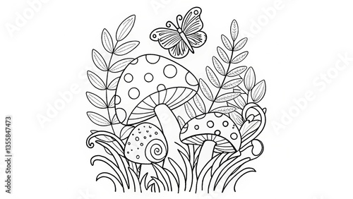 Coloring book page for adults. Black and white illustration of an amanita mushroom, shell, and butterfly among plants