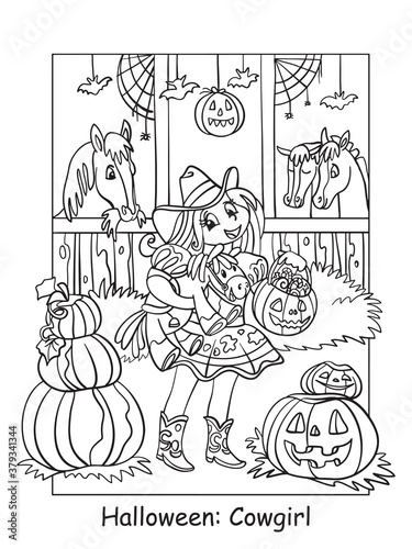 Coloring Halloween cute cowgirl in the stable