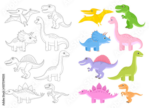 Coloring page of cartoon dinosaurs. Outlined and colored funny vector dino. Simple flat Stegosaurus, Brachiosaurus, Pteranodon, Velociraptor, Tyrannosaurus, Triceratops, Brontosaurus, Spinosaurus