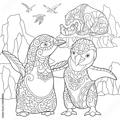 Coloring page of emperor penguins, polar bears and seagulls. Freehand sketch drawing for adult antistress coloring book in zentangle style.