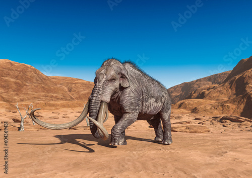 colossadon mammoth is walking and looking for water on the dry desert