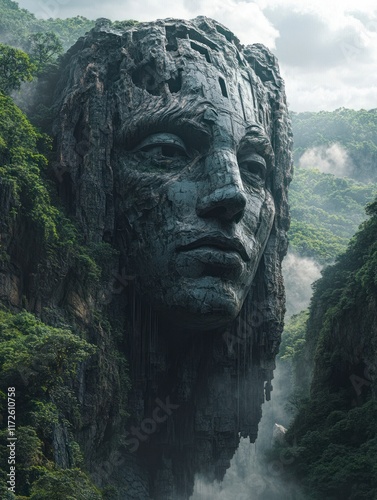 Colossal Stone Face Towering Over a Misty Jungle Gorge