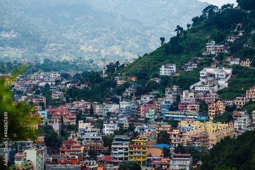 Colourful cityscape infrastructure housing of Kathmandu against mountains in Nepal during early morning light.