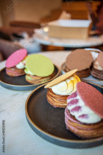 Colourful danish fastelavnsbolle with jam, whipped cream and almond paste in laminated pastry dough with powdered sugar on top served in Copenhagen, Denmark in a cafe bakery Andersen Bakery