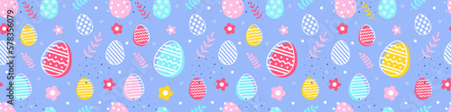 Colourful Easter background with eggs and flowers. Seamless pattern. Banner. Vector illustration