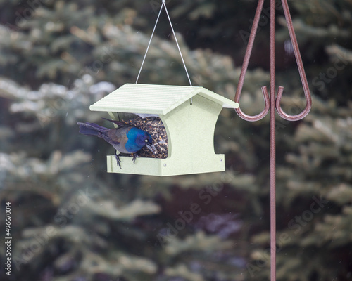 Colourful male grackle eating at a green bird feeder