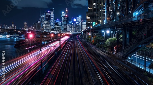 Colourful sky over Sydney city CBD high-rise towers at sunrise around Sydney harbour and the Sydney Harbour bridge in elevated aerial panorama.