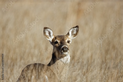 Columbian white-tailed deer standing in a vast expanse of a golden, sun-dappled grassland
