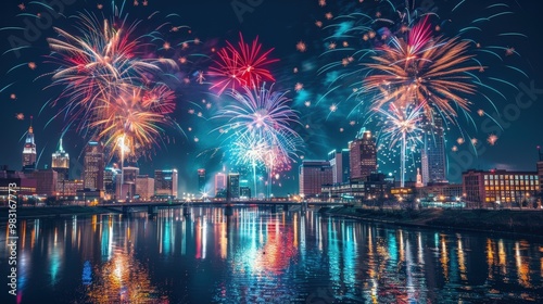 Columbus Day Fireworks Over City Skyline at Night - Vibrant Celebratory Display for Holiday Decor