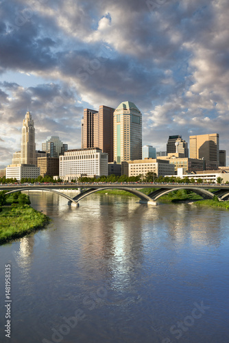 Columbus Ohio downtown city skyline view over the Scioto River USA