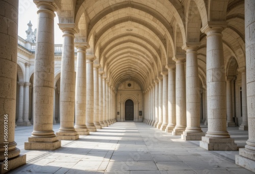 Columnas de piedra que bordean un patio clásico, una suave luz natural filtrándose a través de ellas, arcos repetitivos que retroceden en perfecta simetría