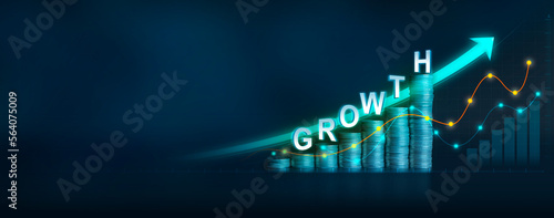 Columns of coins and lines of economic growth with the word GROWTH against a dark blue background