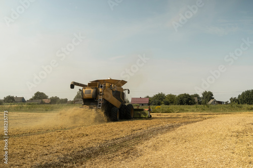Combine harvester agriculture machine harvesting golden ripe wheat field. Agriculture. Combine harvester harvesting wheat with dust straw in the air. Heagy agricultural machinery.