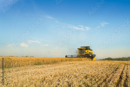 Combine harvester harvests ripe wheat. Ripe ears of gold field on the sunset cloudy orange sky background. . Concept of a rich harvest. Agriculture image