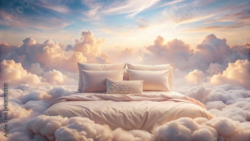 Comfortable and soft pastel pink sleeping bed with heavenly pillows and air clouds in front of sky Depth of Field