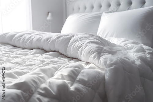 Comfortable bed with soft white mattress, blanket and pillows indoors