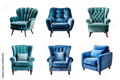 Comfortable blue armchair collection isolated on a transparent background. Interior element