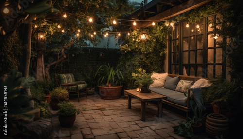 Comfortable chair under illuminated tree brings relaxation to home interior generated by AI