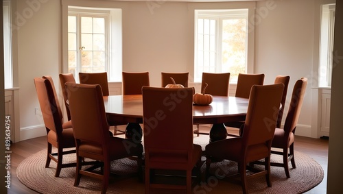 Comfortable dining area in the house, white walls. Round nine-seat table with 4 chairs. Warm cozy autumn atmosphere. Autumn decor