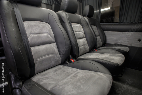 Comfortable interior of a passenger bus with soft seats. The design is made to order. Private covering of cars. Various elements of the bus interior.