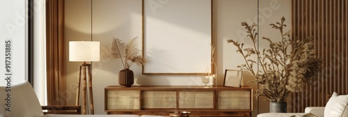 Comfortable room with framed poster mockup and wooden furnishings, showcasing home interior