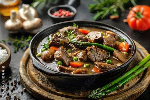 comforting beef stew with mushrooms and fresh asparagus presented in dark pot over black food backdrop