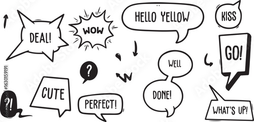 Comic Speech Bubble Doodles – Text Bubbles, Wow, Hello, Perfect, Handwritten Font Icons, Talk Balloon Art