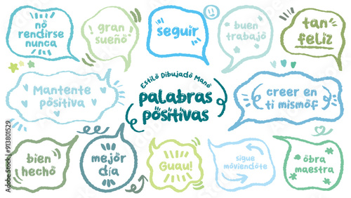 Comic style Spanish cute quote colorful speech bubble with positive words. Set of hand drawn memo frame with Spanish praise. Cartoon doodle crayon drawing cloud, box, message. Blue green Flat vector.