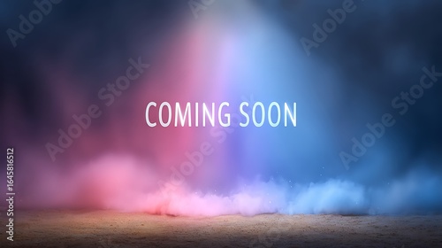 Coming Soon in White Text with Blue and Pink Hues in a Misty Background
