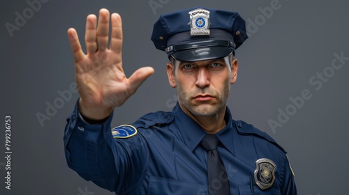 Commanding Police Officer in Uniform Giving Stop Gesture, Authority and Law Enforcement in Action