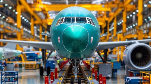 Commercial aircraft production showing the fuselage and a jet engine in a factory