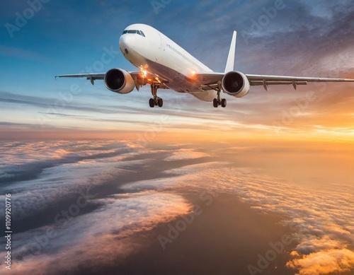 Commercial airplane flying above dramatic clouds during sunset.
