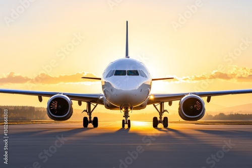 Commercial airplane landing at sunrise with golden light reflecting off the fuselage symbolizing global travel aviation industry and modern transportation