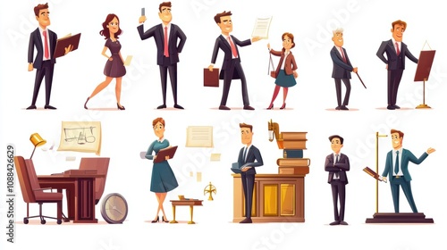 Commercial law isolated cartoon vector illustrations set. Legal advice for business, lawyer facilitate negotiations of business partners, professional employee rights consultancy vector cartoon.