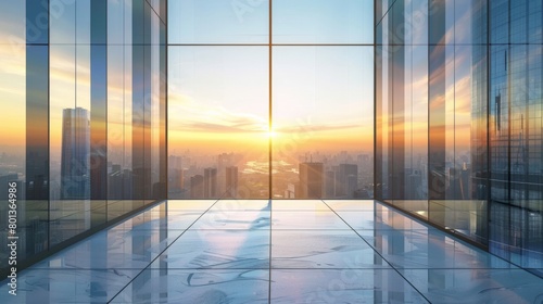 Commercial office building, glass curtain wall, sunlight, urban skyline