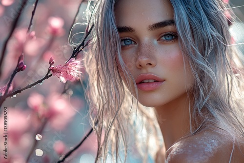 Commercial promotion concept art. Spring mood, morning glow and fog. Pretty caucasian young woman surrounded by cherry blossoms. Beautiful woman in cherry blossoms.