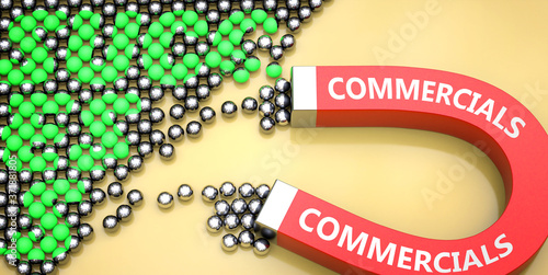 Commercials attracts success - pictured as word Commercials on a magnet to symbolize that Commercials can cause or contribute to achieving success in work and life, 3d illustration